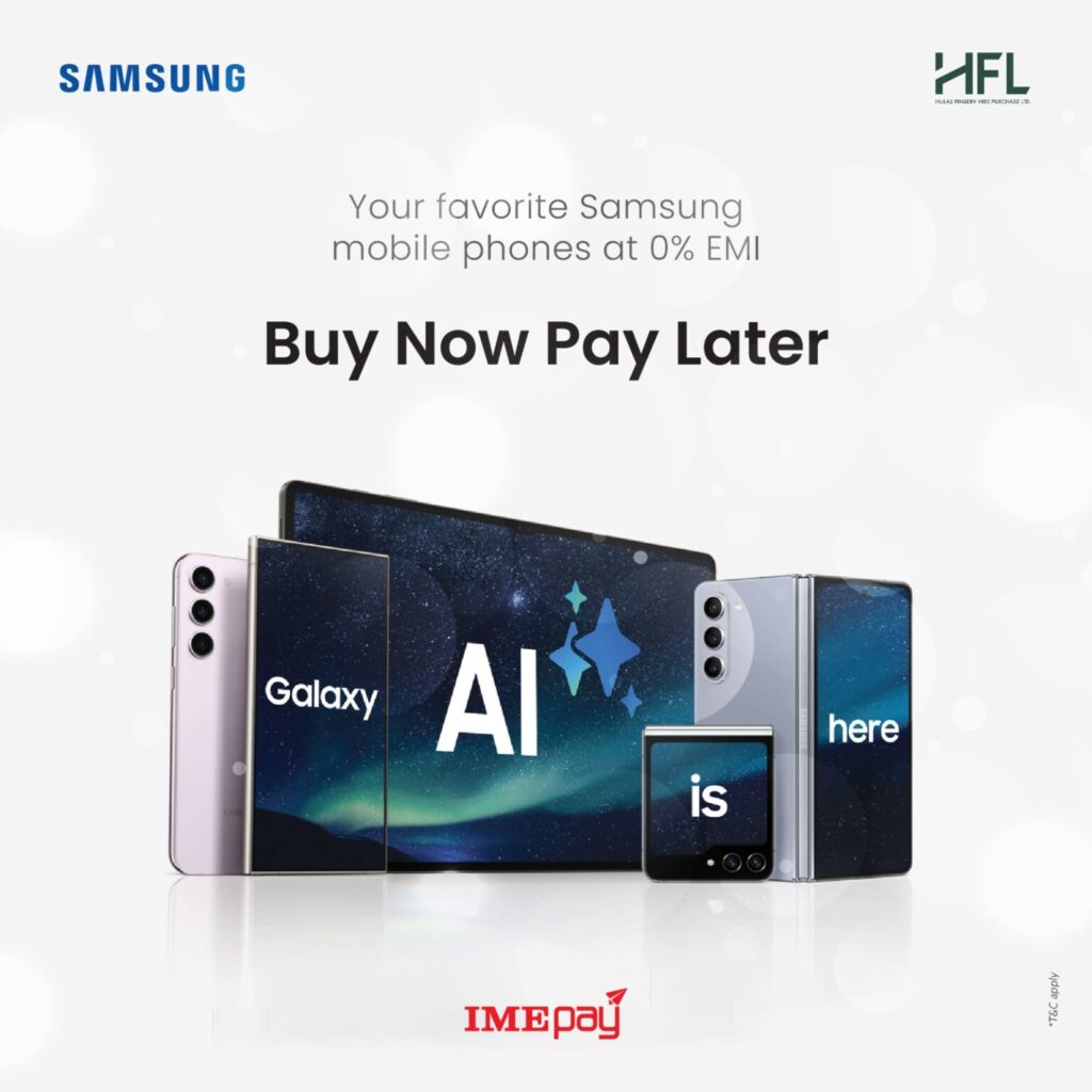 काठमाडौं । डिजिटल वालेट आइएमई पेले ‘बाई नाउ पे लेटर’ सेवा ल्याएको छ । सामसङका प्रिमियम फोन खरिद गर्न इच्छुक ग्राहकका लागि आइएमई पेले हुलास फिनसर्भ नामक कम्पनीसँग सहकार्य गरी यस्तो अफर ल्याएको हो ।